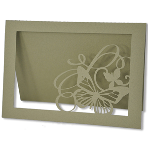 I then moved it of my mat to only get the frame portion of the card, flipping it over to get the butterfly on the left side and then cut. Trimmed off the excess frame following the contours of the design. Masked off the border and inked the flourish/butterfly with Versafine Vintage Sepia and embossed with Emerald Creek Hot Stuff "Oil Rubber Bronze" embossing powder. Applied glue to the large butterfly and sprinkled with Glitter Ritz micro fine glitter "Java Bean" for the body and "Warm Highlights" for the wings. Inked the small butterfly with Distress "Antique Linen", applied glue and sprinkled with the warm highlights. Sponged various colors of Distress on the frame ("Broken China", "Mustard Seed", "Picked Raspberry", "Peacock Feathers") masking off the butterfly flourish, applied a generous coat of Distress Crackle Medium and set aside to dry. Sponged "Ground Espresso" all over. |