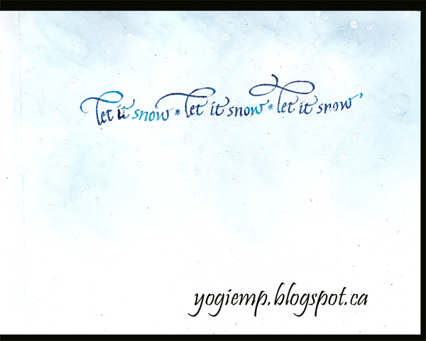 On the inside: Stamped the snow as the front. Stamped the sentiment, inking with the Broken China and then hitting here and there with "Chipped Sapphire", stamped and clear embossed. Sponged all over with the tumbled glass.