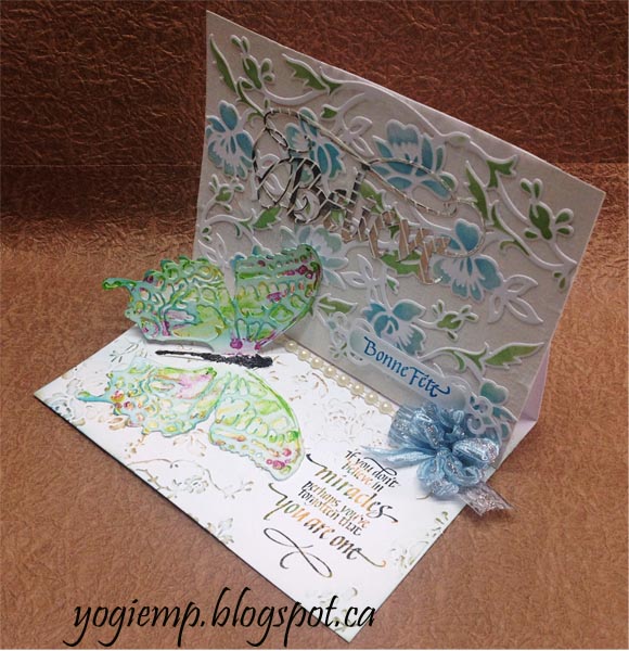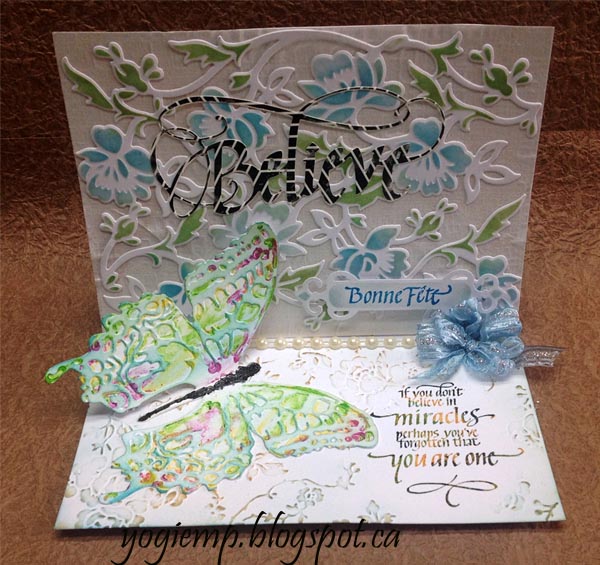 I When I went looking for one of my Cuttlebug dies I came across this one which I haven't used in eons or may never, can't remember... So die cut it at the same time and it's been resting on my desk for a few days... It's just gorgeous, but for me hard to use because I don't want to cover any of it up, but then I have to to get all the other stuff I want on it. sigh!! So I paired it with Tim's humungous Butterfly (die and embossing folder set) I'm using one of the newest Elizabeth Craft Designs dies "Believe" also available on Quietfire Design HERE I'm also using a quote and sentiment stamp from Quietfire Design ("If You Don't believe..." 3pce set); ("Francais" 8 pce set)