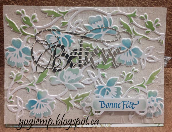 Die cut the Cuttlebug Anna Griffin "Flower Bramble" from heavy weight white cardstock, then ran through dry embossing it and sponged various Distress blues and greens through the die. Adhered to front. Die cut the "Believe" from a silver foiled designer cardstock and adhered to front. Stamped the "Bonne Fete" using Distress "Mermaid Lagoon" and clear embossed then die cut with Spellbinders "Fancy Tag" set. Adhered to front with 3D foam tape. |