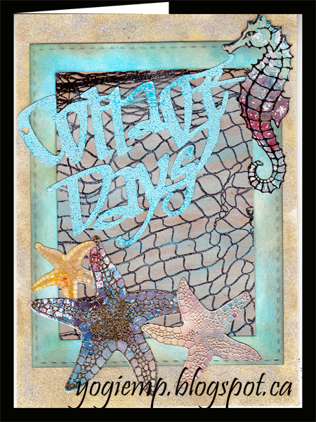 Created some background papers using watercolor paper and Brushos in a multitude of colors... Went a little wild... Then eCut the stamp shapes (if you don't have an electronic cutter, you can fussy cut around your stamped images. I'm lazy though...), stamped with the black and clear embossed the largest starfish and the seahorse. For the smaller starfish stamped with Distress pads and embossed with Queen's Gold or clear. Adhered all the elements to my card front.
