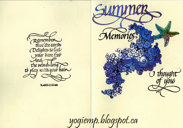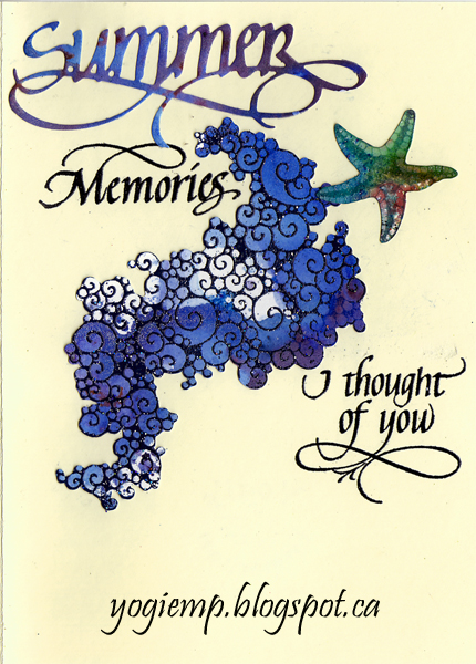 On the inside: stamped the quote on the left side of the card using the black and clear embossed. Die cut the word "Summer" from more of the Brush watercolor paper and adhered to inside. Stamped the word "Memories" using the black and clear embossed. Another of the Designs By Ryn stamps the sea spray bubbles, also cut from the Brusho watercolor paper, stamped with Distress "Mermaid Lagoon" and embossed with Emerald Creek Hot Stuff "Midnight Sky" embossing powder. adhered to card along with the smallest starfish. Stamped part of the "When I saw This..." stamp, masking off the upper section, using the black and clear embossing. |