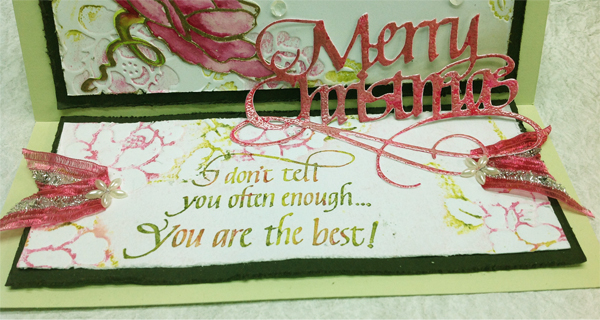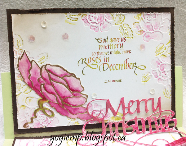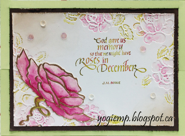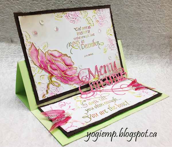 As I mentioned on the yellow rose card, after getting my new stamps I immediately created an eCut file (no fussy cutting...) of the rose, cut from watercolor paper, stamped using Versafine "Vintage Sepia" and embossed with Queen's Gold embossing powder. Painted wet in wet with QoR watercolors, then went over everything with iridescent medium. Inked up my embossing folder using Distress mini pads "Spun Sugar" on the flowers and then here and there with "Picked Raspberry" and "Crushed Olive" on the leaves with here and there "Forest Moss". Misted with water and embossed on white cardstock. The front embossed pieces is actually the "debossed" effect. Distressed the edges with Tim's distresser, then sponged some brown on the edges and on the front. Adhered to a chocolate brown cardstock which I also distressed the edges, then adhered both layers to the easel front. |