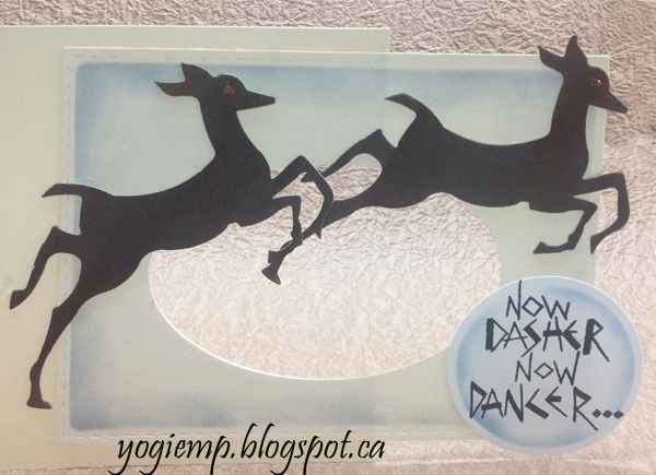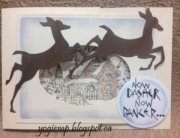 The over piece to create the full size card was a left over piece that had been die cut using Elizabeth Craft Designs "Stitched Rectangles", then used the "Stitched Ovals" to die cut the opening. Sponged with Distress "Chipped Sapphire" then adhered to card front. Die cut the reindeer (Sizzix Tim Holtz "Reindeer Flight") from a brown scrapbook cardstock which was laying on my desk from a previous project... Adhered to front adding mini amber rhinestone eyes. Stamped the "Now Dasher..." which is one of my own rubber stamps created with my calligraphy using Versafine Black Onyx and clear embossed. Die cut with Spellbinders "circle" die set and sponged with the blue. adhered to card front.