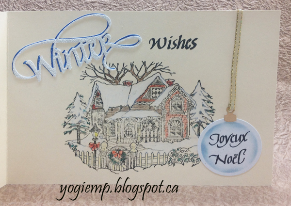 On the inside: stamped the house to fit into the oval front opening using the black. Colored with Prisma colored pencils. Die cut the word "Winter, twice from white cardstock. Top layer inked with Versamark and embossed with Emerald Creek Hot Stuff "Soft Fallen Snow" embossing powder. The under layer colored with a blue colored pencil. Adhered both layers off set, then onto the card. Stamped the word "Wishes" with the black and clear embossed. Stamped the "Joyeux Noel" (first cutting the stamp between the 2 words) using the black and clear embossed. Die cut the with circles die set, sponged with the blue and adhered to inside. Die cut the bauble holder, embossed with Queen's Gold embossing powder. Adhered the gold metallic ribbon using Sookwang tape. |