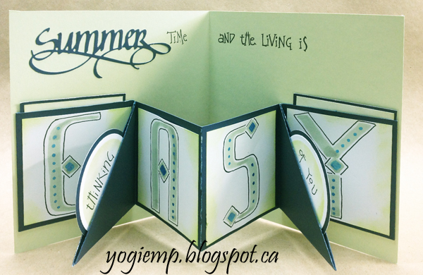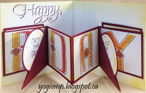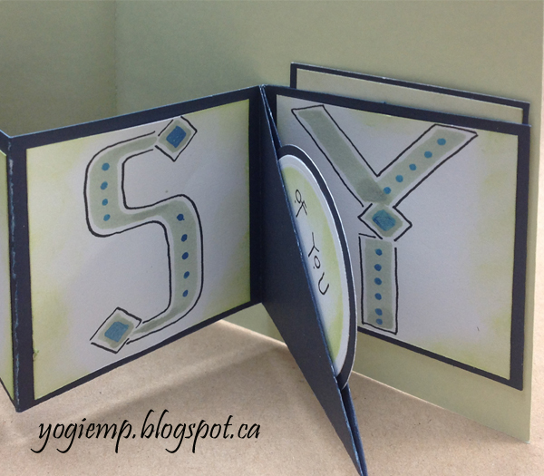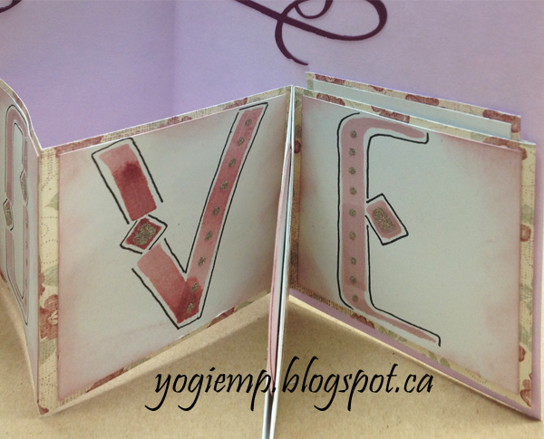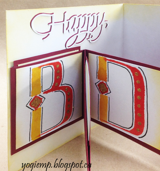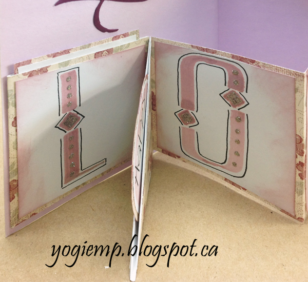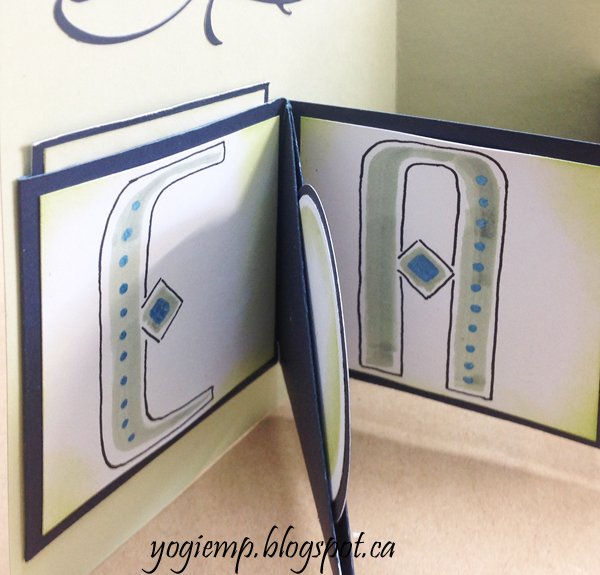 Size: 5.5"w x 6"h This one was done with a slightly heavier cardstock, which I don't recommend. The edges cracked... Adhered to a citrus green card base. Letters embellished with a metallic gel pen. |