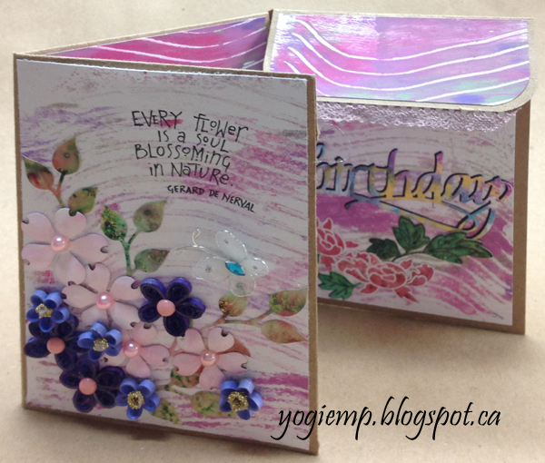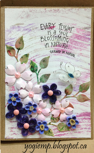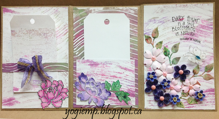 I cut a piece of Bee Paper "Bogus Recycled Rough Sketch Paper" 12" x 12". Scored, cut away slivers and folded. Adhered edges to create the pockets. The left over pieces would have created the tags, but I decided to use white cardstock for the tags instead... Used my large Gelli plate and applied dabs of acrylic paints (Delta Ceramcoat "Lilac Dusk"; Folk Art "Spring Green" & "Lavender"; Americana "Desert Turquoise" & "Royal Fuchsia"), brayered to blend then used one of my new tools (XiemTexture Comb Soft Flex) which I altered by cutting ever other prong from the large side of the comb, creating wave pattern through my paint, then printing onto 85# white cardstock, also making a 2nd generation print which I really loved. Used the 1st generation on the flaps, back panel and inside center small pocket and the 2nd generation every where else. I wrote in my text following the contours of the scored design using a Copic 0.1 Multi liner black pen in my funky monoline style. Text: every Flower is a soul blossoming in nature. Gerard de Nerval Adhered all my quilled elements from previous Wednesday quilling sessions... Also adding some die cut flowers (Elizabeth Craft Designs) cut from 85# soft finish cardstock and sponged with a dirty pink sponge lightly, then a brown Distress marker to accent the little nicks. Added various pearls to the flower centers. Created the leaf decorative paper from watercolor paper and all the greens from Colour Burst. Die cut with Curly Leaves die (Elizabeth Craft Designs) Final touch added the butterfly from my stash. |
