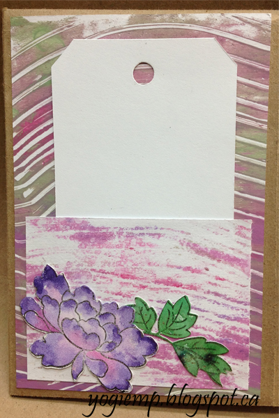Adhered a scrap piece of the 1st generation Gelli print to create a pocket. Stamped the "Enjoy Your Day" using Distress Picket Fence and embossing with White embossing powder onto some Bogus paper and die cut with Spellbinders circle die set. |