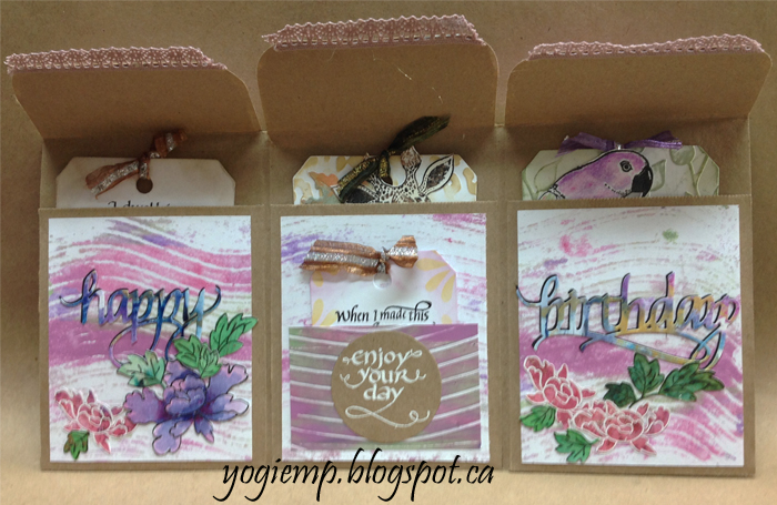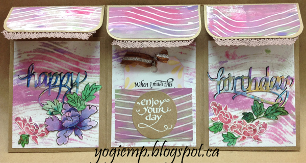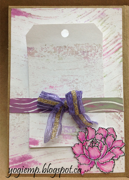 For the quote: Masked my main stamp "When I Saw This... masking off the word "Saw" and inking with Versafine Black Onyx and clear embossed. Inked my other stamp, masking off the text except for the word "made" with the black, and stamped in place. Clear embossed. Stenciled the edges using a dirty pink and yellow sponge. Tied a brown/silver Sari ribbon. PS: since I didn't use a stamp positioner this time, my word "made" is slightly off set. Sigh!! Have to get around to making myself a Misti tool... |