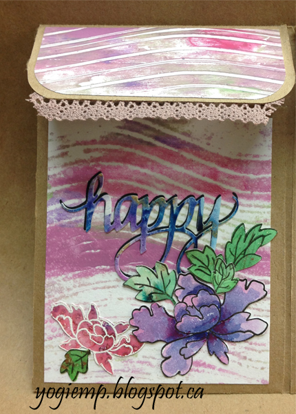 ![]() P1 Inside Die cut the Happy from Colour Burst decorated cardstock using some of the new Liquid Metals. Layered it off set onto a black die cut. Added the eCut flowers and some lace trim to the flap edge. |