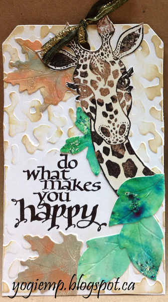 ![]() P2 Tag I love this giraffe stamp... inked with Versafine Vintage Sepia and hit here and there with Black Soot, stamped and clear embossed. Fussy cut around it. Embossed the tag using Cuttlebug "Animal Prints" embossing folder, hit high points with Scattered Straw" and some "Antique Linen". Stamped the quote with Black Onyx and clear embossed. Added the die cut leaves from my stash and the green/gold Sari ribbon. |