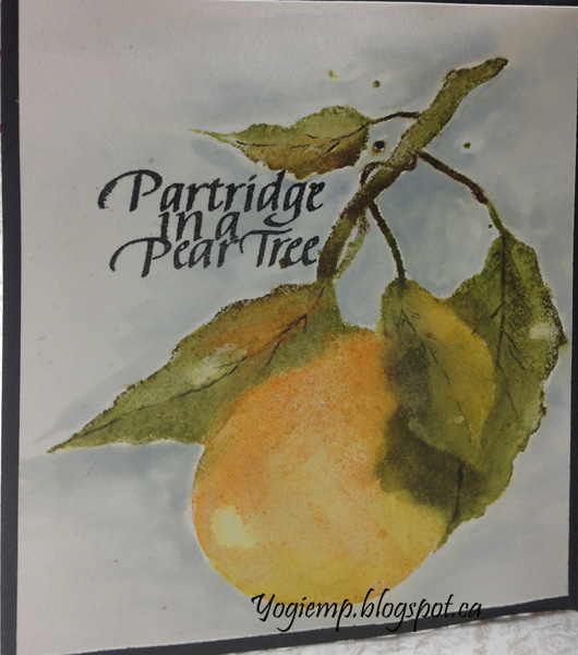 I used the Penny Black "Perfect Pears" stamp, inking with Distress mini pads and stamping on 90# Arches HP watercolor paper, then using a wet paintbrush to move the colors. Adding blue to the background. Dried then stamped the sentiment using Versafine Black Onyx and clear embossing. |