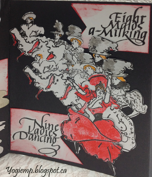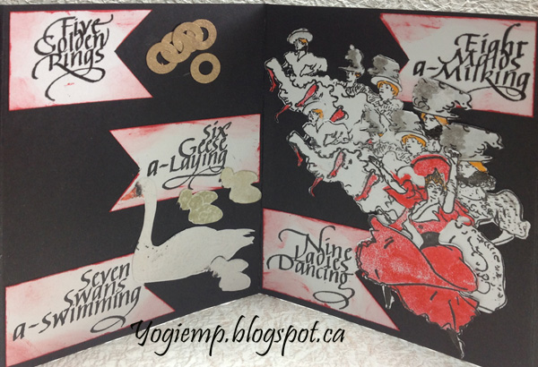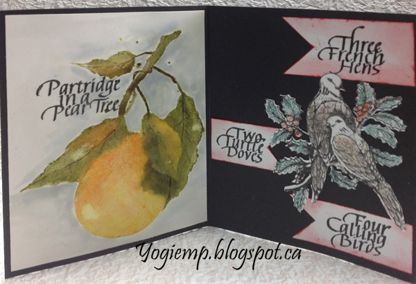 I stamped the remaining 12 days onto white cardstock using the black and clear embossing. Cut them close to the stamping adding a picot edge. Hit the edges direct to paper with "Festive Berries" pad, then sponged around the edges. Created a silhouette image, imported to my electronic cutter software and cut out the dove image from white cardstock, then stamped (Flourishes "Doves & Holly") using the black and clear embossed. colored with Prisma colored pencils. |