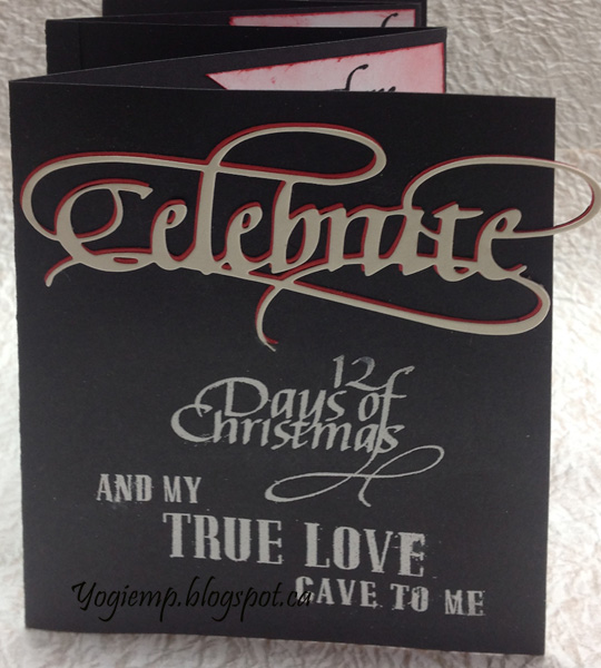 I started with a 12 x 12 piece of black cardstock, cut it at the 5.25h and then accordion folded it at 4", & 8". Repeated and then spliced the 2 sections together at the back. Die cut the "Celebrate" from a creamy white cardstock and a red cardstock. Adhered the two together, slightly off set. Stamped the "12 Days of Christmas" using Picket Fence and white embossing powder. Stamped the "and my true love gave to me" (Just Rite "Brayton" alphabet stamp set) with the picket fence and white embossing powder. Tied a big and wide - 1.5"w gold metallic gauzy ribbon bow around the accordion to keep it closed. I decided to keep it unattached so it slides off easily.