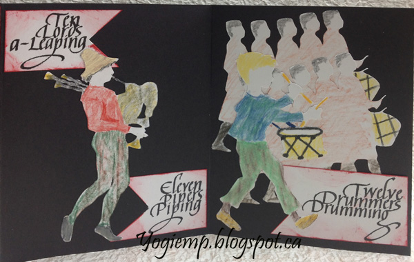 Lacking the appropriate stamps.... I searched online and found silhouette type images of the piper and drummers, electronically cut them and colored with Prisma colored pencils. |