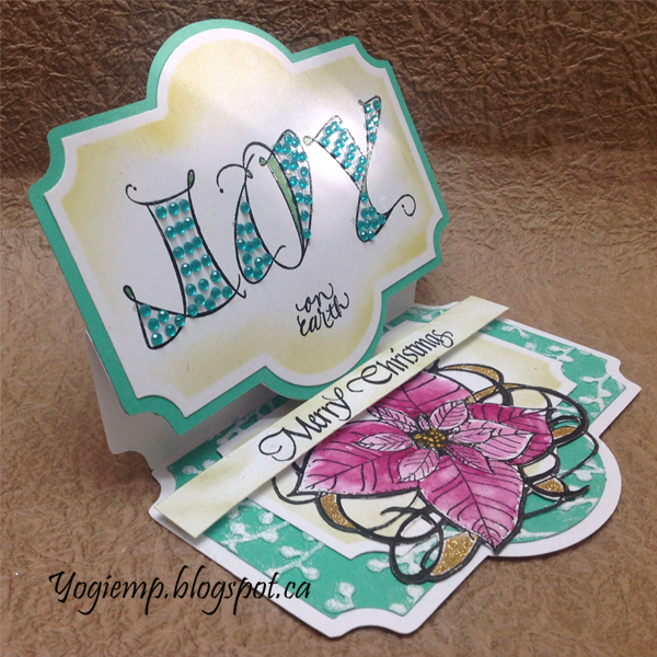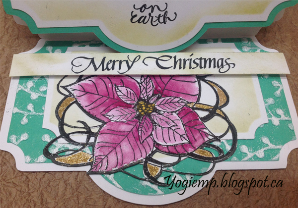 Scored, and folded my white card and die cut with Spellbinders "Labels 21" die set to create the easel. Cut several smaller labels from bright green or white cardstock. Adhered a green layer to the front. Stamped the "Joy" with Versafine Black Onyx and clear embossed on white cardstock label. Sponged around the edges with "Crushed Olive". Adhered small green rhinestones to fill the letters. Colored the open spaces with a green metallic pen. Stamped the "...on earth" masking the rest of the stamp, using the black and clear embossing. Adhered to front. On the Floor: Dry embossed a green layer using Elizabeth Craft Designs "Berry Branch" embossing folder. Hit the high points with Distress "Picket Fence" and embossed with white embossing powder, adhered to floor. Adhered a white labels layer, sponged with the crushed olive. Created a silhouette file to cut the poinsettia from white cardstock, stamped with the black and clear embossed. Painted with QoR watercolors. In the negative spaces, applied Quickie Glue and sprinkled with gold micro fine glitter. Adhered to floor. Stamped the "Merry Christmas" on white cardstock with the black, clear embossed, sponged with some olive and trimmed down to the length of the card width. Adhered to floor with 3D foam tape to act as the stopper.