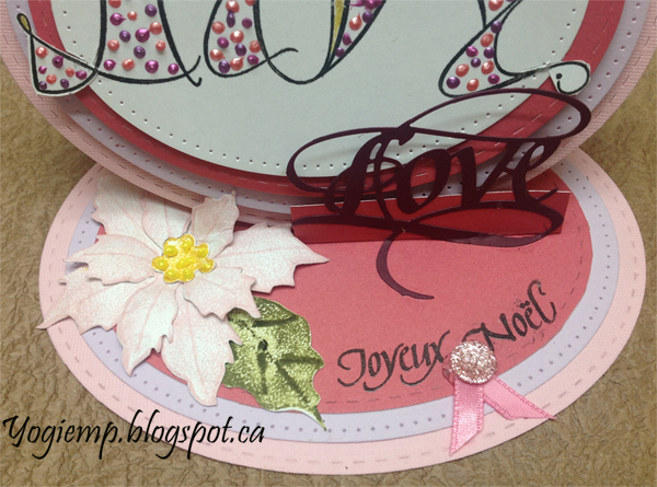 Scored, and folded my pink Bazzill monochromatic card and die cut with Elizabeth Craft Designs "Stitched Ovals" die set to create the easel. Cut several smaller ovals from various pink toned cardstocks. Adhered the layers to the front with 3D foam tape. Stamped the "Joy" with Versafine Black Onyx and clear embossed on white cardstock. Cut around some of the letters to cut that oval shape without cutting the letters off. Applied various colors of Liquid Pearls dots. Colored the open spaces with a gold gel pen. On the Floor: Die cut several pink layers with the oval set and adhered to floor, one on top of the other. Die cut the poinsettia (Sizzix Tim's "Tattered Poinsettia" Bigz die) from 65# Soft Finish cardstock. Sponged with Distress "Spun Sugar", tooled the back of the pertals with a small balled stylus to create the vein line, then went direct to paper with the Spun Sugar. Adhered to floor adding bright yellow Liquid Pearls dots. Stamped the sentiment with the black and clear embossed. Die cut the word "Love" from a burgundy cardstock, adhered to a folded piece of support cardstock and adhered to floor to act as the stopper. Final touch, added a piece of pink narrow ribbon and a pink gem. |