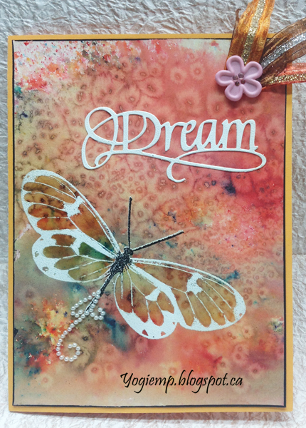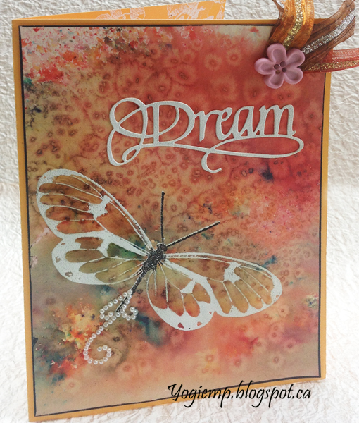 Created the background using watercolor paper misted with water, then sprinkled with various Brushos, misted with more water. Allowed it to dry slightly and then sprinkled with kosher coarse salt. When totally dried, removed the salt. Trimmed down. Used my Misti and stamped with the largest butterfly (Penny Black "Butterfly Trio"), using Distress Picket Fence and embossing with white embossing powder. Then inked the body only with Versafine Black Onyx and embossed with Emerald Creek "Oil Rubbed Bronze" embossing powder. Edged the paper with a black marker and adhered to card front. Die cut the "Dream" from a cream toned cardstock, inked with the picket fence and embossed with the white. Adhered to card front. Added a spray of pearl flourish on the butterfly tail. Also adhered some Sari Ribbon and a pink floral button. |
