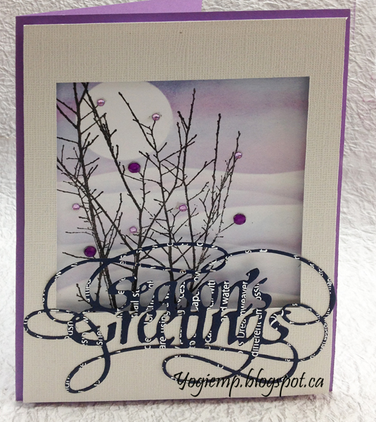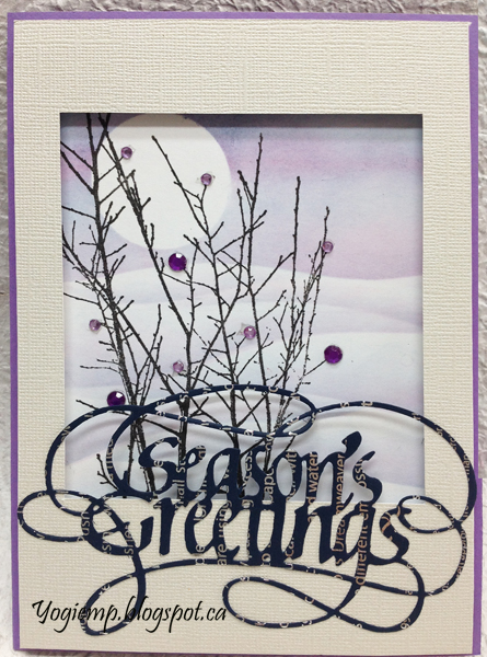 Created the Snowy Hills (see step by step pics below). Trimmed down, stamped the bare branches (Penny Black) using Versafine Black Onyx and clear embossed, then adhered to card front. Cut a piece of white pearlized textured cardstock, slightly smaller than my card base. Cut a window and adhered to card front with 3D foam tape. Adhered a bunch of mauve and purple rhinestones. You may recognize the cardstock I used to die cut the "Season's Greetings" - packaging from Dream Weaver stencils...Adhered to frame. |