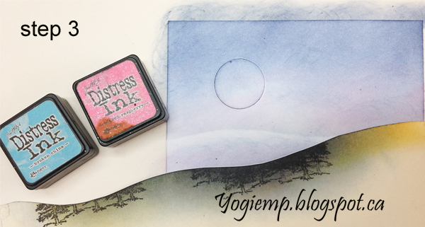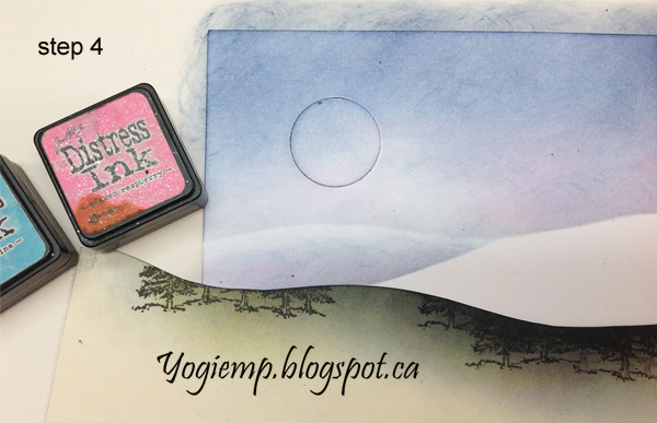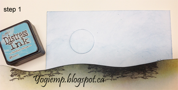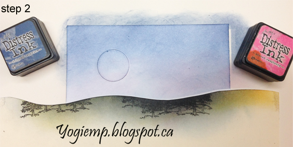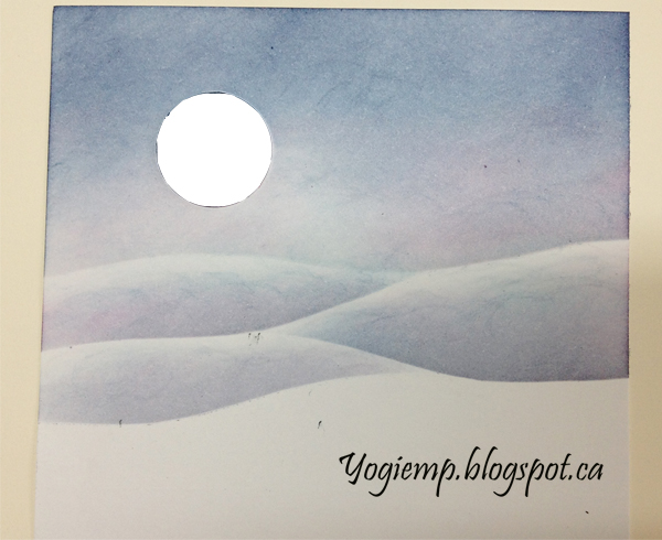Step 1: Punched a 1" circle to create my moon mask. Adhered to my 5"w x 7"h cardstock. Cut a wavy piece of cardstock to act as my mask for the hills. Sponged all over the upper area with "Broken China". Please note: I use dirty sponges so my colors are not true. The blue sponge has various other blues mixed in giving a unique color. |