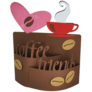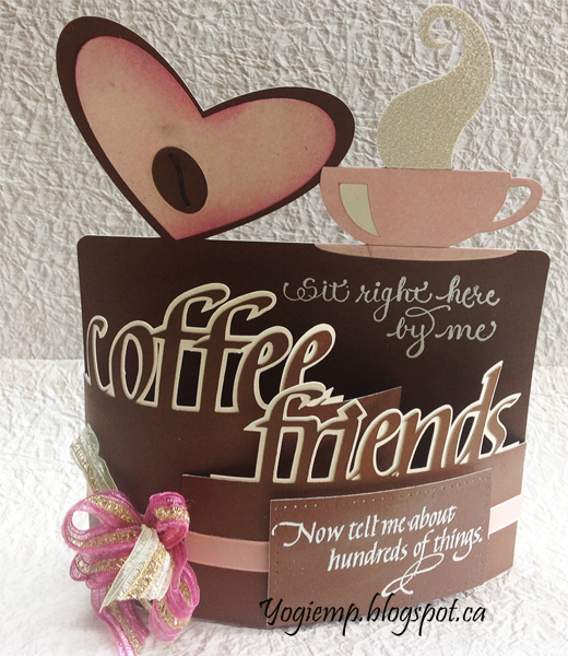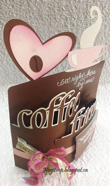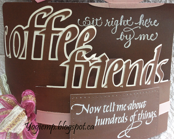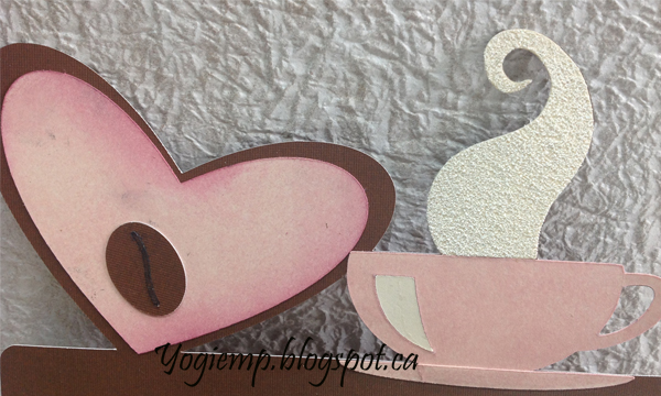 Now this is where it becomes a little tricky. I'm not that savvy when it comes to Studio software, but I need to use it to get the score lines since they don't seem to show up properly in my SCAL software - sigh!!. But now I wanted a shadow layer for the words, So opened the file in SCAL, Sized it the same as in Studio and pushed everything off the mat except the word part, cut from a cream toned cardstock, trimmed the border down and adhered to the back of my word. Cut all the various other elements from the cream toned cardstock, including a smaller coffee bean and smaller heart. Sponged and direct to paper with Distress "Spun Sugar" for the cup and the smaller heart. Inked the steam with Versamark and embossed with Emerald Creek "Soft Fallen Snow". Stamped the "Sit Right Here...", masking the rest of the stamp, inking with Distress "Picket Fence" and embossing with white embossing powder. Stamped and inked the "Now Tell Me..." as above on a separate piece of the brown textured cardstock. Die cut with Elizabeth Craft Designs "Stitched Rectangles", moving the die to get the size I needed. |