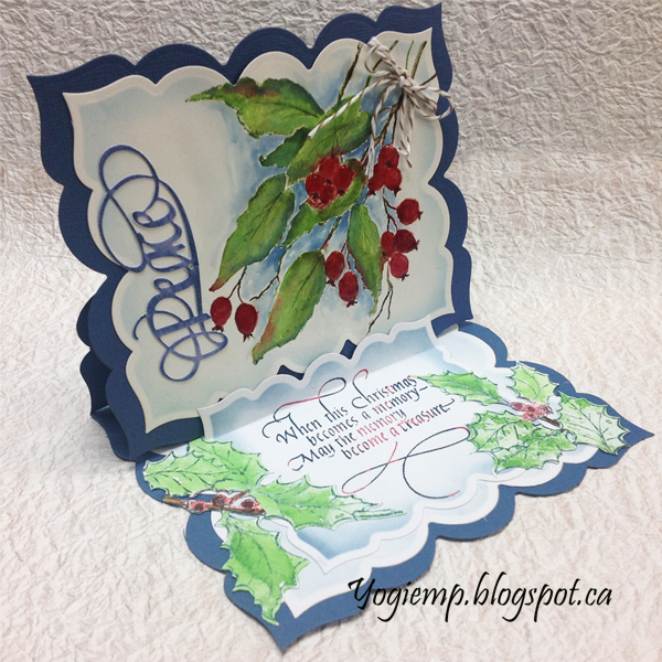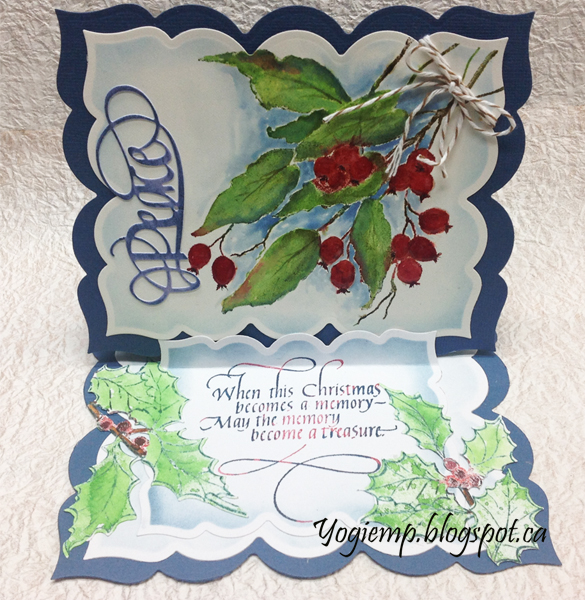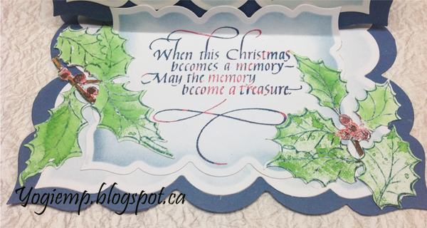 On the floor: Stamped the quote on white cardstock inking with Versafine "Satin Red" all over and hitting here and there with "Blue Lagoon". Clear embossed. Die cut with the largest of Labels 23. Sponged stormy sky around the edges. Added a crease/fold in the upper area to act as my stopper. Created a silhouette image of my holly stamp Sheena Douglas "Holly", electronically cut it from white cardstock, then inked my stamp with green, red and brown , stamped then clear embossed. Used the same colors of Distress pads and painted it in. Cut it apart where needed and adhere to both sides. |
