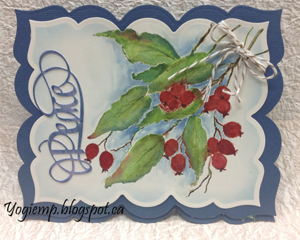 I used my Misti tool, inked the Penny Black "Berry Kissed" stamp with various Distress mini pads in appropriate colors on 90# Arches HP watercolor paper. Spread the inks around with a paint brush and water adding more color where needed. Added some background color, wet on wet technique. Die cut with the next size of Grand Labels 23. Sponged the edges with a dirty blue sponge. Added Glossy Accents to the berries. Ran the Stormy Pad over my bluish die cut word "Peace". Applied Versamark and clear embossed. |