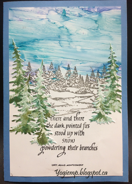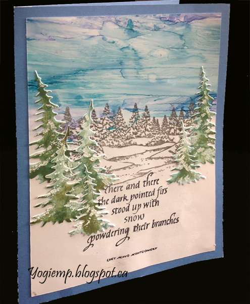 folded my deep blue toned card. Created my alcohol sky by dropping dots of alcohol inks onto my craft sheet (Aqua, Stream, Pool), adding a bit of blending solution and swiping my glossy paper through the wetness to create a streaky sky. Helped the streaks a bit with a touch of blending solution on my felt. Then dribbled some blending solution here ad there. Stamped the pine tree scene (Deep Red "Winter Stream") using Versafine Black Onyx and clear embossed very carefully... It does bubble if too much heat is applied, but when cool lays flat again. Die cut a bunch of pine trees (Dee's Distinctively "Pine Trees" 3pce set), sponged all over with Distress "Pine Needles" then hit here and there direct to paper with "Forest Moss". Stamped the quote using the black and clear embossed. Trimmed down and layered onto the blue card front. |