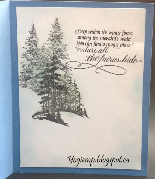 On the Inside: Stamped the quote using the black and clear embossed. Stamped the background fir trees (Deep Red "Winter Pines") and the hilly scene (Cornish Heritage Farms "The Pines") using the black and clear embossed. Lightly went over the background trees with a dirty green sponge. |