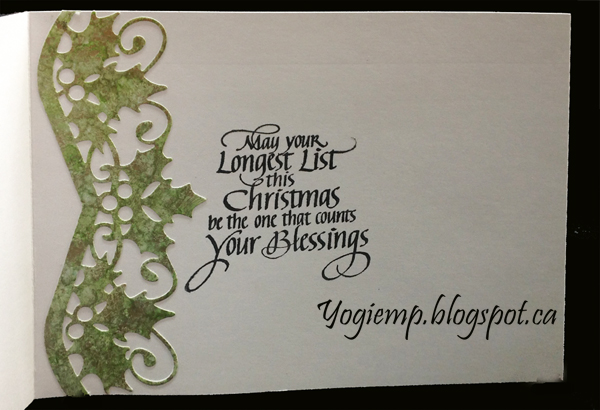 On the Inside: Die cut another of the holly from some scrap green/gold alcohol ink paper. Adhered to left edge. Stamped the quote using the black and clear embossed.