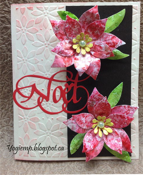 brown cardstock along the right side Created my alcohol background - inking my felt (Poppyfield, Flamingo and Gold Mixative) and a touch of blending solution, pouncing until leased with the look... Die cut with Marianne Designs "Poinsettia". Tooled the petals using a piece of tracing paper on top of my alcohol flowers to protect the surface. Die cut the centers from some yellow colored cardstock. Adhered the parts together then onto my card front adding some die cut leaves from another piece of alcohol decorated paper. Added a medium sized yellow/greenish toned pearl in the center. Die cut the Noel red toned cardstock. |
