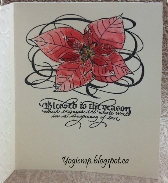 On the Inside: Inked the poinsettia stamp with Versafine Black Onyx and clear embossed. Painted with some Distress pads on an acrylic block ("Candy Apple" and "Fired Brick"). Painted the center with Mustard Seed. Stamped the quote with the black and clear embossed. |