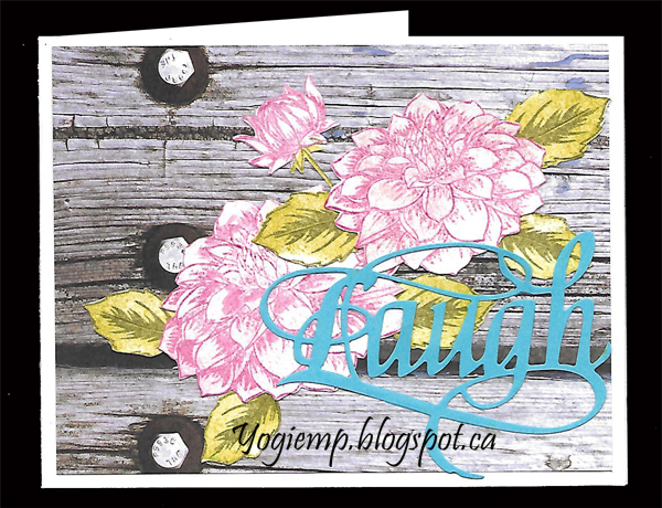 As mentioned, electronically cut the flowers and stamped with Distress pads ("Spun Sugar" for the base; "Picked Raspberry" for the outline and shading; the Leaves "Crushed Olive" for the base; "Forest Moss" for the outline and shading). Adhered in a pleasing arrangement. Die cut the "Laugh" from some scrap aqua cardstock. |