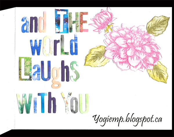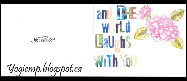 Inside Right side: Raided my stash of alphabet letters (Elizabeth Craft Designs "Lower & Upper Case Alphabet sets") Adhered them for the quote "and the world laughs with you" Adhered another dahlia and leaves On the Left Side: stamped the "Just Because" using Versafine Black Onyx. |