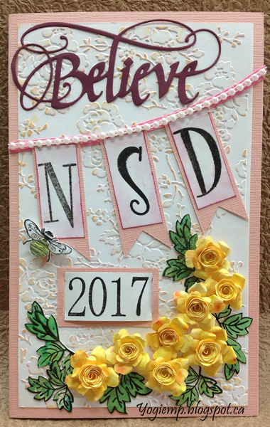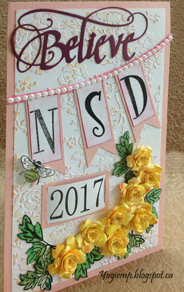 Created: October 23, 2016 I was commissioned to make an encouragement card for an up coming Mary Kay NSD. The Mary Kay color is pink, the symbol is a bumble bee and a new NSD is given a bouquet of yellow roses. Since we don't know when she'll become an NSD, I've included several years that can be inserted in the slots each year. I'm using an A Way With Words dies from Elizabeth Craft Designs "Believe" also available on Quietfire Design HERE