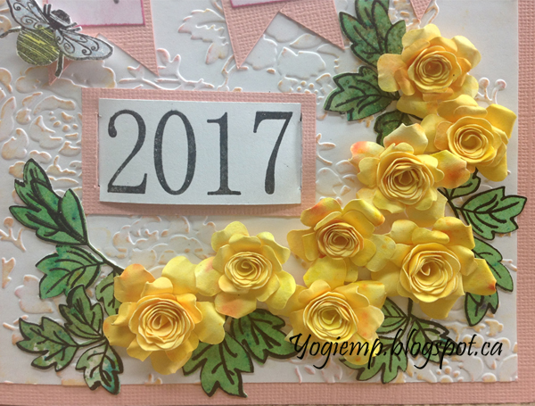 Love those roses... Using my favorite rose die Die-Namic "Heirloom Hybrid Rose". I first decorated my 90# Arches HP watercolor paper, saturating it with water and sprinkling with Colour Burst and Brusho's in all the yellow shades. Misted with more water and tilted here and there. Did the same on the other side. Allowed to partially dry and sprinkled with coarse kosher salt. When dry, brushed off the salt and die cut. I electronically cut some smaller roses as well. Tooled and shaped the flowers. Cut a piece of white cardstock (5"w x 8.8"h) and ran through my machine with Cuttlebug Anna Griffin "Rosa" embossing folder. Hit the high points very lightly with Distress "Picked Raspberry" and then "Mustard Seed". Adhered to my pink Bazzill monochromatic card base. Die cut the "Believe from a burgundy cardstock (Dreamweaver packaging...) and adhered to front. Created the banner by adhering a piece of bright pink narrow ribbon on a curve. Stamped the letters (MSE "Retro Caps" alphabet set) using Versafine Black Onyx and clear embossed. Trimmed down, hit the edges with the pink pad, adhered to the pink textured cardstock, trimming it down and adding the picot edge. Adhered to ribbon then adhered a piece of pearl bead ribbon over top. Adhered a piece of pink textured cardstock slightly larger than my inserts, cut slots on either side. Stamped the years (Just Rite "Large Number" set) onto white cardstock using the black and clear embossed. Trimmed down adding a tab on either side the width of my cut slots. |