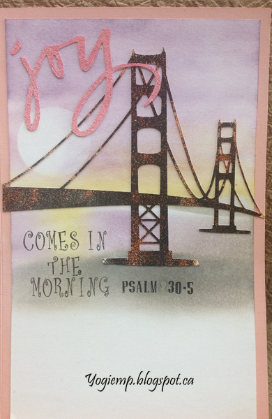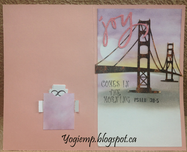 Inside: eCut the Golden Gate Bridge image from white cardstock, inked with "Tea Dye" and embossed with a sprinkling of Emerald Creek "Thanksgiving" and "Oil Rubbed Bronze". Created the background on white cardstock, using various mauves, pink, yellow and purple Distress pads. Cut a circle mask for the sun, then sponged the colors as needed. adhered the bridge. eCut the "Joy" from white cardstock, sponged with raspberry and embossed with Distress "Worn Lipstick" embossing powder. Stamped the rest of the psalm using Just Rite "Curlz" alphabet set, inked with the black and clear embossed. "Joy comes in the morning - Psalm 30.5". The quote and the bridge has special meaning for her. |