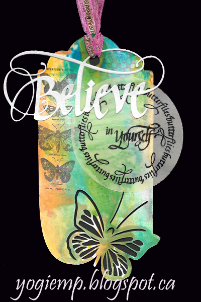 Used my electronic cutter to cut the butterfly tag from the above cardstock. Stamped the square grid corner stamp using Archival pads and rolling the stamp for a more organic look. Stamped the butterflies along the left side (Tim's "Attic Treasures") using Versafine Black Onyx. Stamped the butterfly circle using the black on a yellow toned piece of vellum and clear embossed. Die cut with Spellbinders circle die set. Stamped the "in Yourself" masking the rest of the sentiment using the black and clear embossed. Adhered to tag with Glossy Accents. Die cut the "Believe" from white cardstock, inked with Versamark and embossed with Emerald Creek Hot Stuff "Silver Satin Pearl" embossing powder. Final touch added a pink Sari ribbon. |
