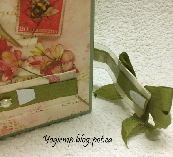 Cut a piece of the 1"w white gauze ribbon approximately 13" long. I applied a piece of Sookwang tape to the center of the ribbon and adhered the solid wrinkle olive ribbon to it. I folded and adhered the edge of the ribbon to make a neat strong edge (approx 1/2"fold), then adhered the ribbon to the box with more Sookwang tape leaving a space from the right edge (see pic above). Taped the front, hinge edge and the back only. Folded over and adhered the end of the ribbon (approx 1"w). Tie a decorative multi loop bow and adhere to closure ribbon with hot glue. Cut a piece of velcro Hook & Loop tab (the whole tab is too large...) and adhered to edge of ribbon. Removed the release paper from the other piece and while still stuck together pressed down to adhere the other section to the start piece of the ribbon. Adhered a decorative pearl ribbon using hot glue. (only on the front, back and loose extension of ribbon (DO NOT PUT ANY ON THE BACK HINGE AREA). |