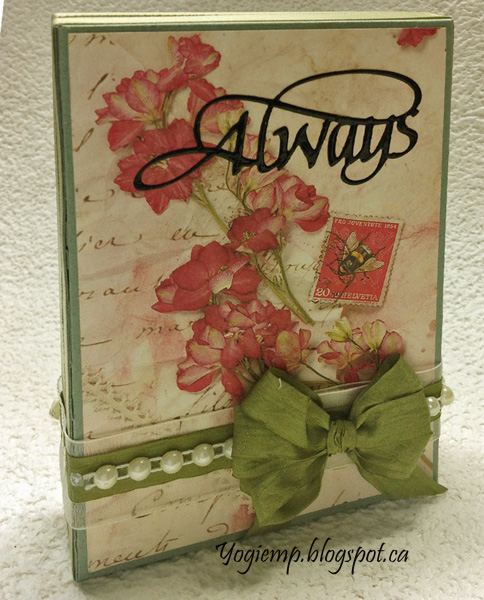 On the Front: Cut the vintage floral paper slightly shy of my box shape to have a small border all around and adhered to front. Die cut the "Always" from black cardstock, inked with Versamark and clear embossed. Adhered to front.
