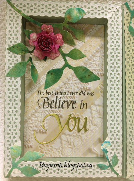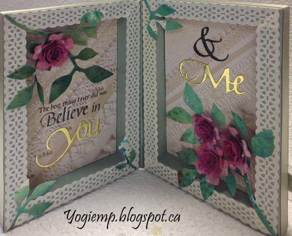 Pasted paper ribbon (Creative Imaginations) around the top edge all around. Cut insert pieces for the floors from a lace paper scrapbook pad. Stamped the quote (minus the word "me") using Versafine Black Onyx and clear embossed. Die cut the word "You" from a gold mirror cardstock and adhered appropriately. Adhered the stamped lace paper to the floor. |