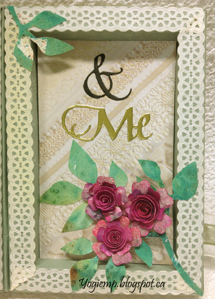 Raided my stash of roses (Die-Namics Heirloom Hybrid Rose die). Die cut the leaf stems (Sizzix Tim's Bigz die "Garden Greens") from a Brush/Colour Burst decorated watercolor paper. Adhered the elements to the floor and frame edge strategically. Repeated the process to the right side box Die cutting the ampersand from black cardstock. The "Me" I cut from gold mirror cardstock and surgically cut away from the rest of the Merry Christmas word.