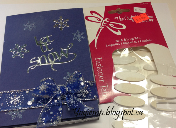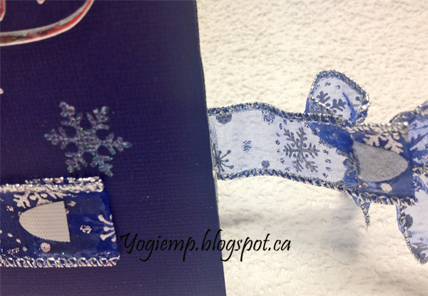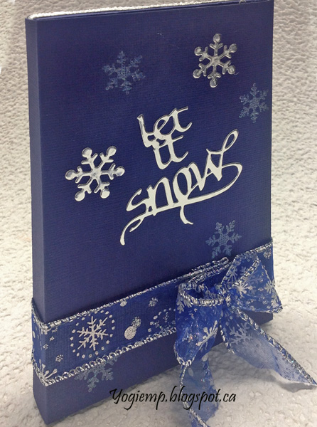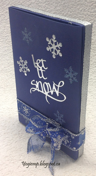 On the Front Cover & Assembly: Die cut the word and snowflakes from the silver mirror cardstock. Adhered to cover. Stamped some of the snowflakes using the Picket Fence and embossing with Emerald Creek "Iridescent Shimmer" embossing powder. Adhere the cover to the box. Adhered the snowflake blue gauze ribbon, tied a bow, and adhered the velcro tab. (see instructions below)