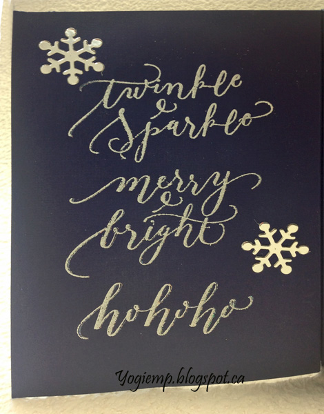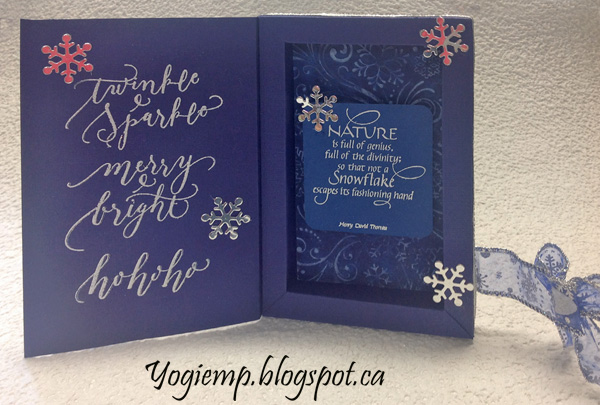 On the Inside Cover: Stamped the holiday words using the Picket Fence and the white embossing powder. Adhered a couple more snowflakes. |
