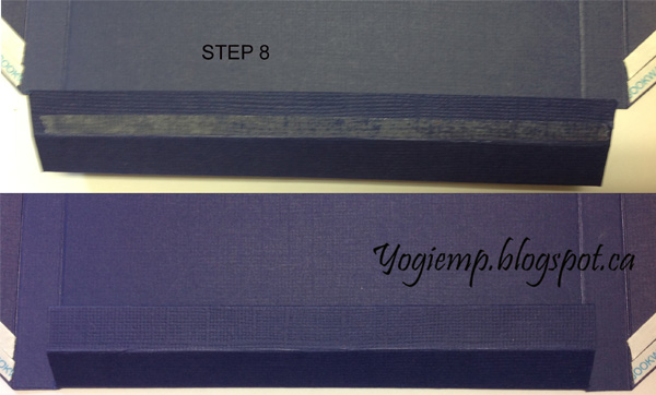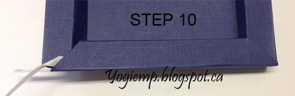 STEP 8: Starting on long 10" edge, remove release paper on one side. Fold over on the 2nd score line, then fold over onto the floor of box. This will give you a perfectly aligned piece. Press down firmly. repeat on other 1" side. Pop up to look like a frame edge. |