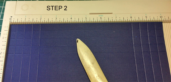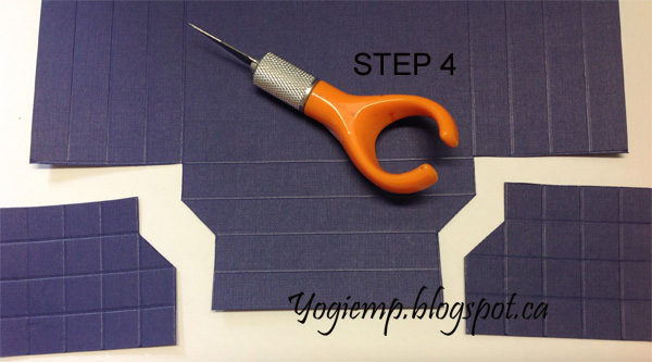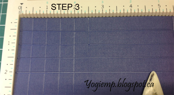 STEP 3: On the 8" side, score at the 3-1/2" point 1" down. Repeat at the 5-1/2" point. Flip cardstock to the