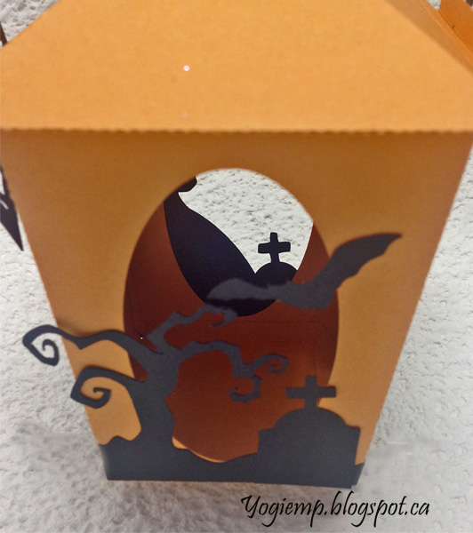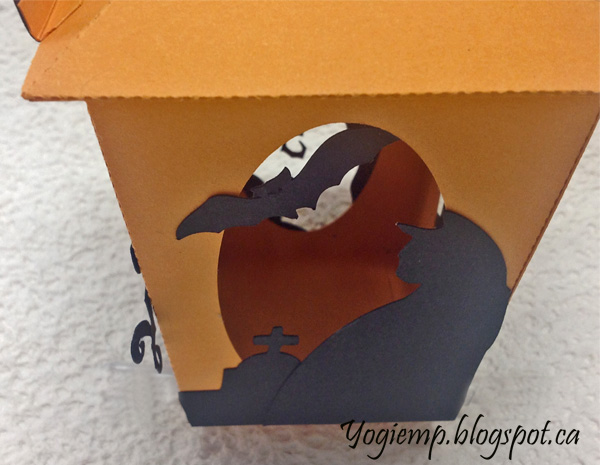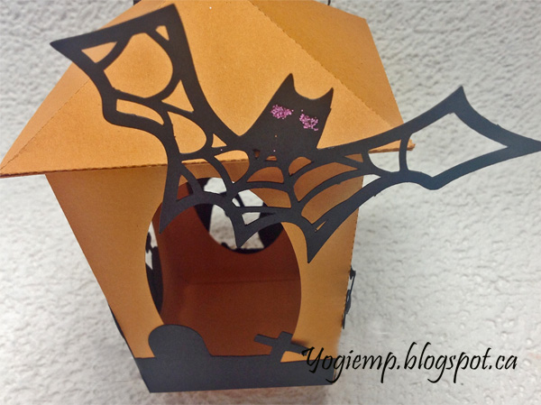 I cut everything out, folded along all the score lines. Then started gluing my embellies on the lantern body only. Adhered the side, bottom and top to create the lantern shape. (PS Make sure you leave enough room to squeeze your little candle light through one of the ovals.) Adhered the tabs for the roof. Pierced a hole through the peak an floor of the roof, strung my black ribbon through the hole with a long darning needle, adhere to the floor with Sookwang tape. Added some hot glue at the peak to thoroughly secure my ribbon and make sure the hole doesn't expand. Adhered to lantern body. Adhered a small "L' shaped piece, the length of the word, to the "Boo" to adhere to roof as well as to strengthen the word. |
