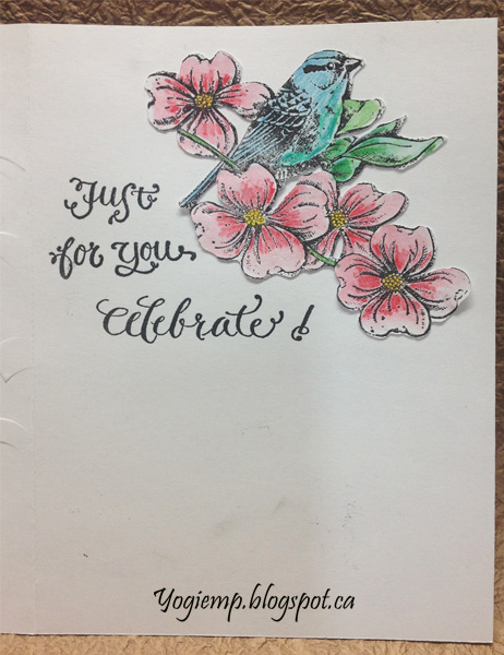 Inside: I stamped the bird (Stacy Stamps "Chipping Sparrow") using the black and cut around it. Colored with Derwent Inktense watercolor pencils. Adhered to inside. Again used my Misti to stamp the words using the black and clear embossing.