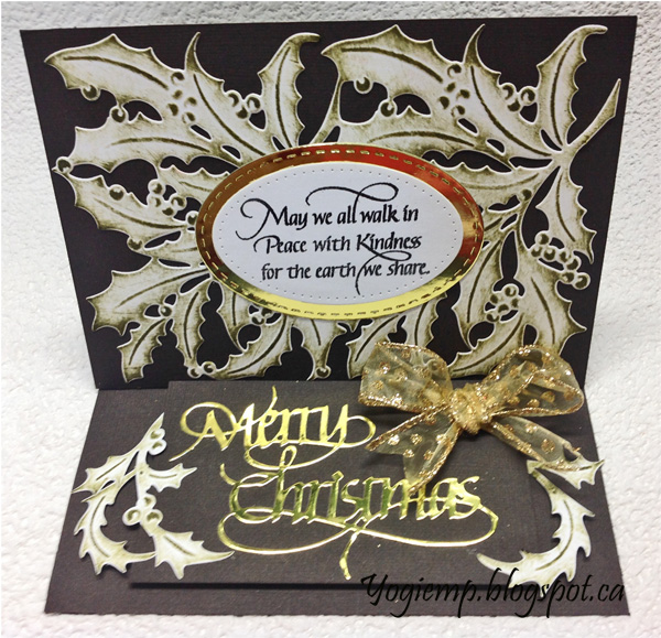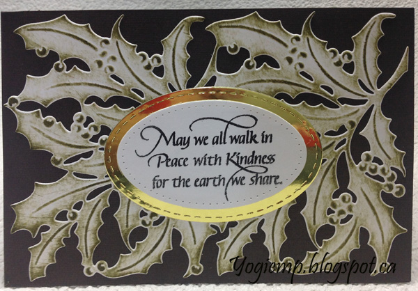 Die cut and embossed the holly layer. Hit the high points with a large Distress pad "Forest Moss". Adhered to front. Stamped the quote onto white cardstock an die cut with Elizabeth Craft Designs "Stitched Ovals". The die cut a larger oval from gold mirror cardstock. Adhered both together then onto the card front. |