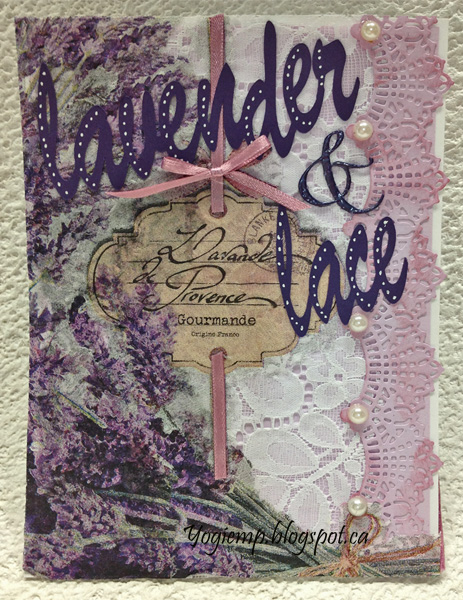 Cut another piece same size as card. Adhered a piece of lace to the center of the white cardstock. Die cut the lace border (Joanna Sheen "Isobel") from a pale lilac cardstock and sponged a bit of Distress "Tattered Rose" around the edges. Adhered to right hand edge. With a wet paintbrush, worked around the images and then gently tore them away, then adhered them to the piece of white cardstock. Adhered the label and added a piece of real dusty rose narrow ribbon and tying a bow. Electronically cut the "Lavender Lace" words using a brush text font and cutting from a deep purple cardstock. Used a white gel pen to add the doodle dots. Die cut the "Ampersand" also from the deep purple cardstock. Adhered the half pearls to the lace die cut using Glossy Accents. |